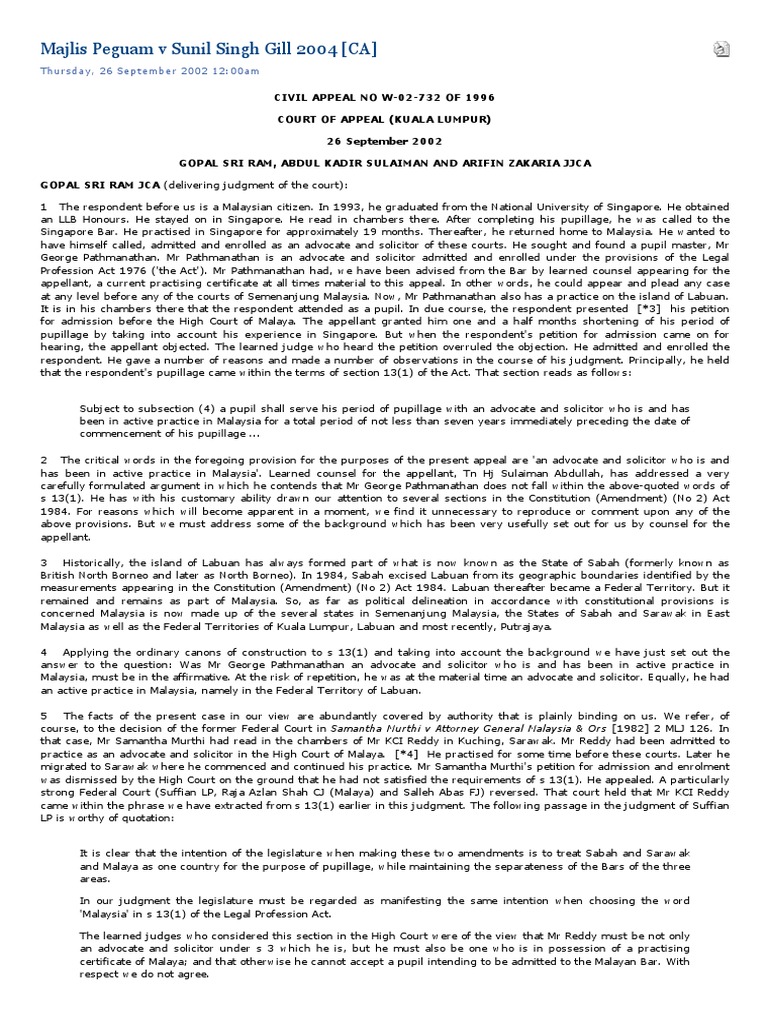 Case Reading Majlis Peguam V Sunil Singh Gill 2004 Ca Advocate Solicitor