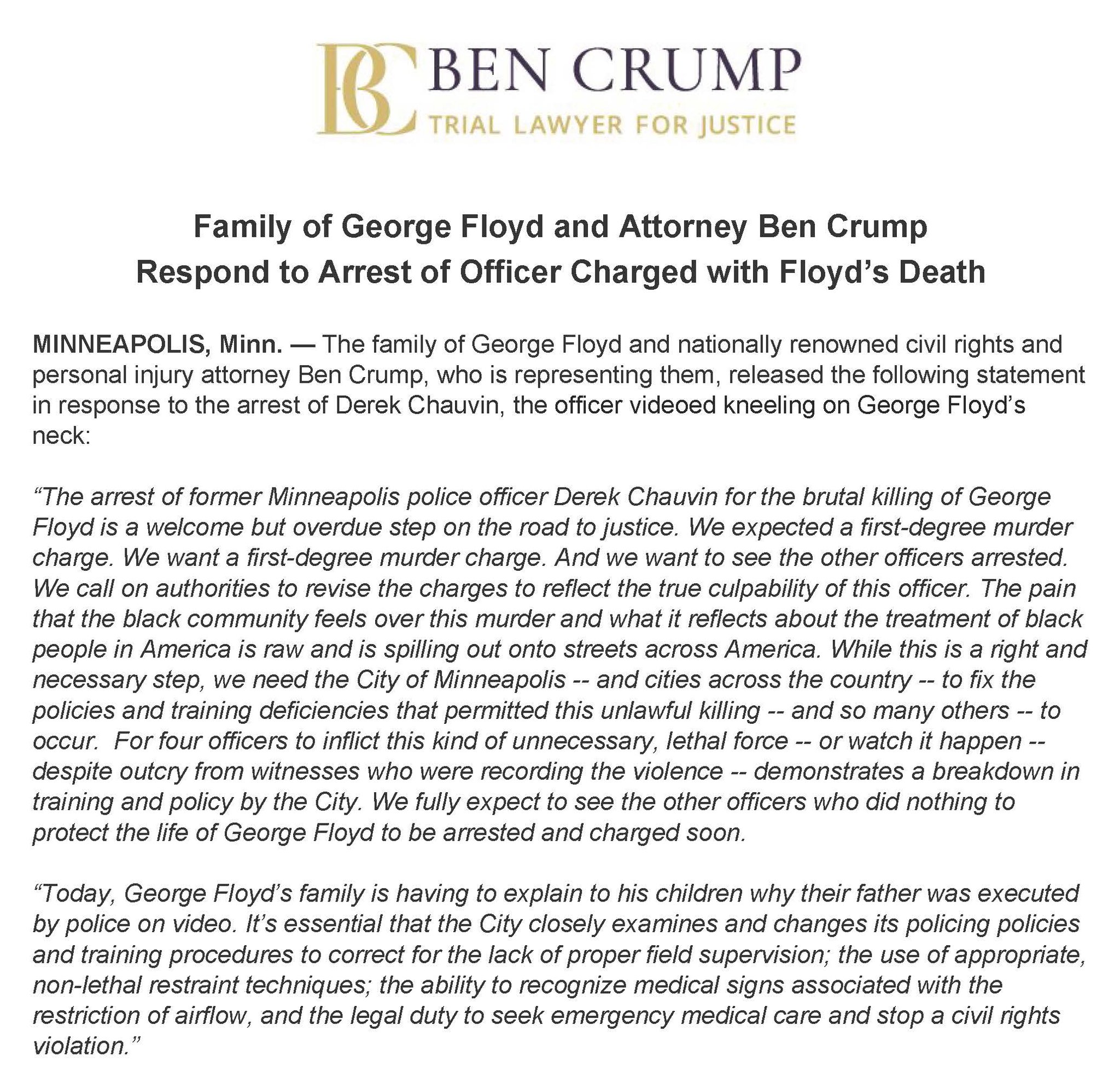 Ben Crump On Twitter Family Statement The Family Of Georgefloyd And I Released The Following Statement In Response To The Arrest Of Derek Chauvin The Officer Videoed Kneeling On George Floyd S Neck